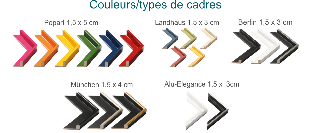 Les cadres sont disponibles en différentes couleurs. Vous les trouverez dans les illustrations ci-dessous.