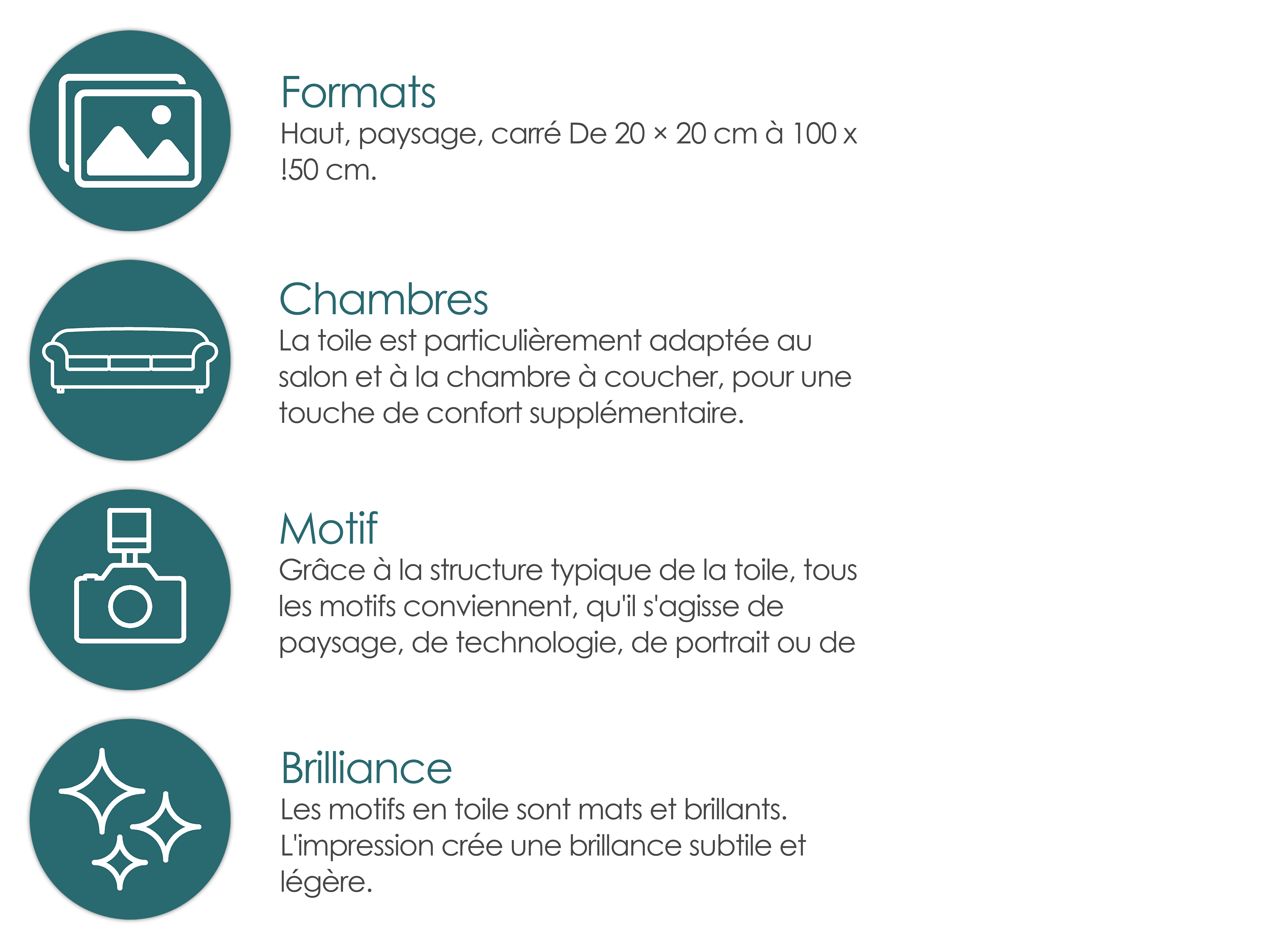 Grâce à la structure de la toile, les couleurs s'animent et donnent vie à la pièce. Nous imprimons avec une grande qualité sur la toile, ce qui donne à votre image un effet "wow". Vous pouvez choisir entre différentes tailles, en fonction de la pièce et de l'occasion. Vous préférez une toile avec ou sans joint d'ombre ? Ici aussi, vous avez le choix, nous faisons les deux. Vous aussi, faites briller votre œuvre d'art et mettez-la parfaitement en scène.