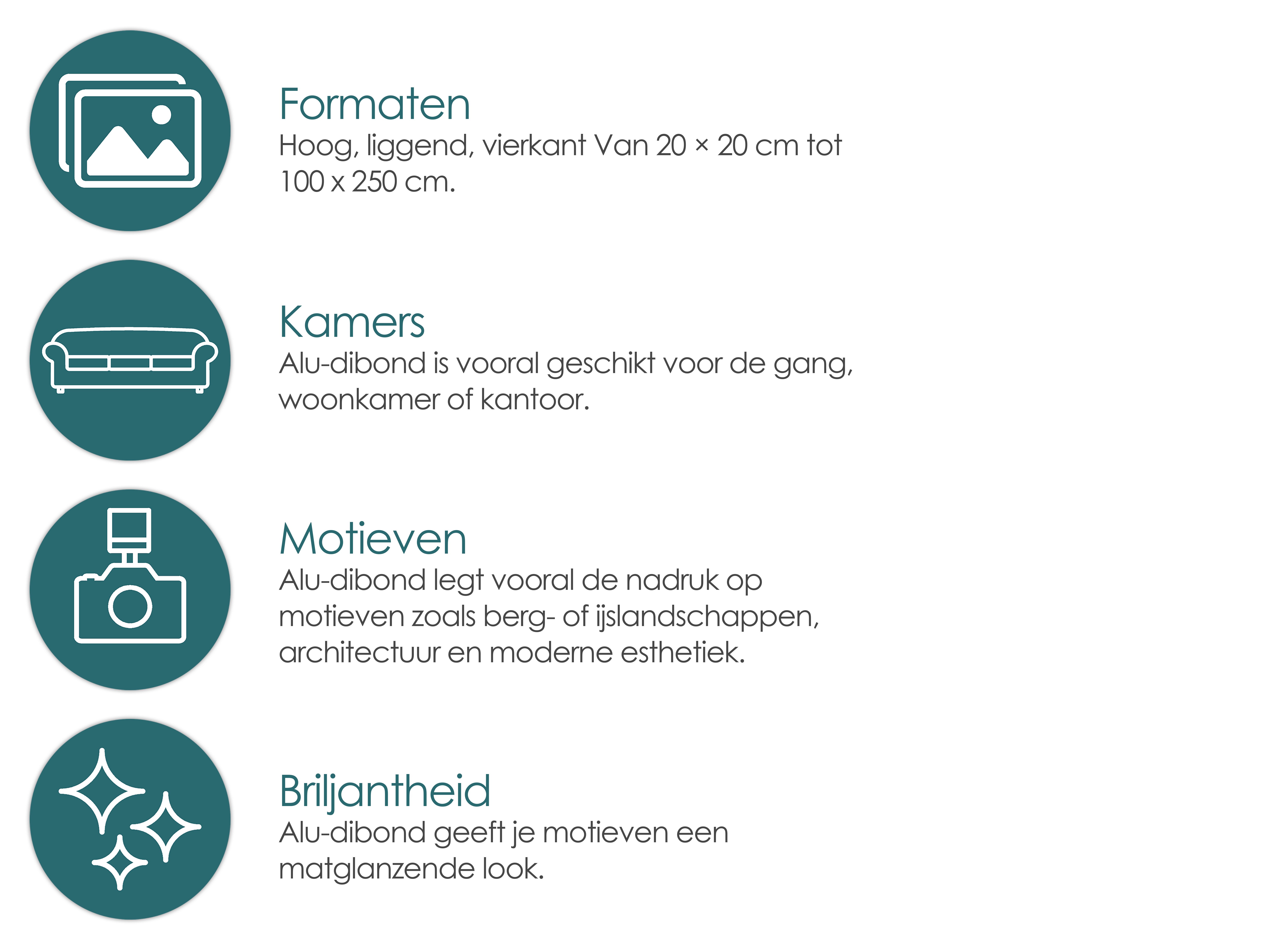 Er wordt een afdruk met hoge resolutie gebruikt, die wordt uitgevoerd tot 1440 DPI in 12 kleuren van de betreffende afbeeldingssjabloon. De afbeelding wordt afgedrukt op FineArt-papier en gelamineerd op een 3 mm dikke Alu-Dibond®. Dit zorgt voor maximale stabiliteit. Elke Alu-Dibond®-afbeelding wordt voorzien van een UV-beschermende laminering en geleverd.